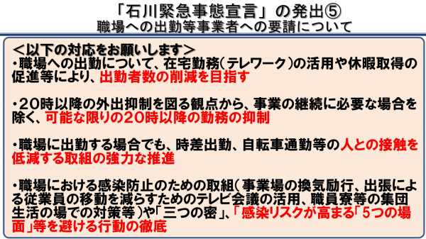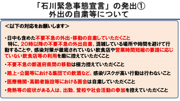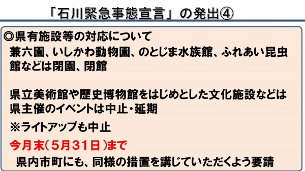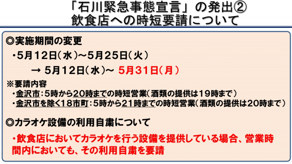 本日5/11、石川県では「ステージ4(感染拡大緊急事態)」へ移行し、県独自の「石川緊急事態宣言」が発出されました。
