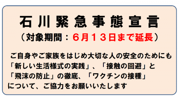 県内では「石川緊急事態宣言」が6月13日まで延長されました。
