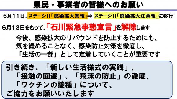 6月13日をもって、「石川緊急事態宣言」 を 解除 されました!