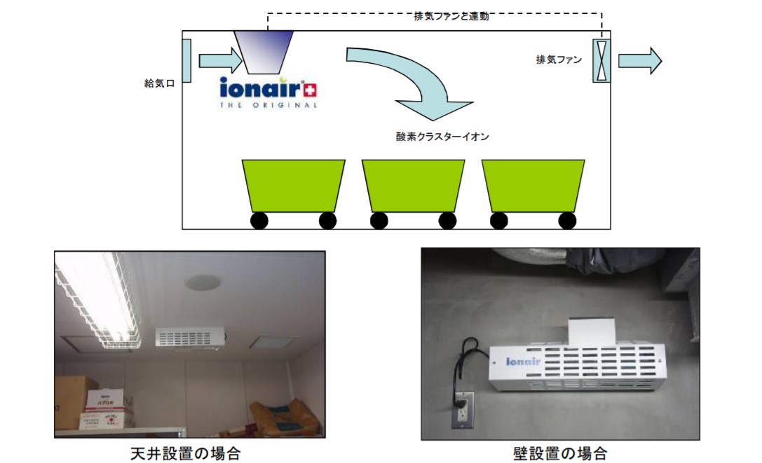 イオネア酸素クラスター脱臭装置はゴミ保管庫の天井部又は壁面に露出で設置致します。