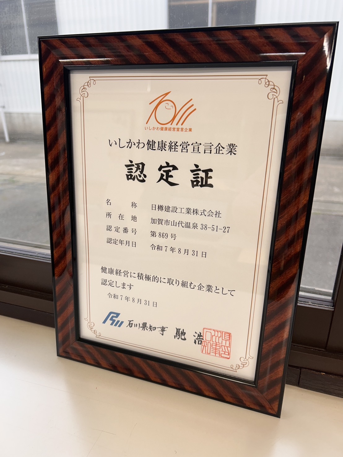 このたび、弊社は『いしかわ健康経営宣言企業』として認定されましたことをお知らせいたします